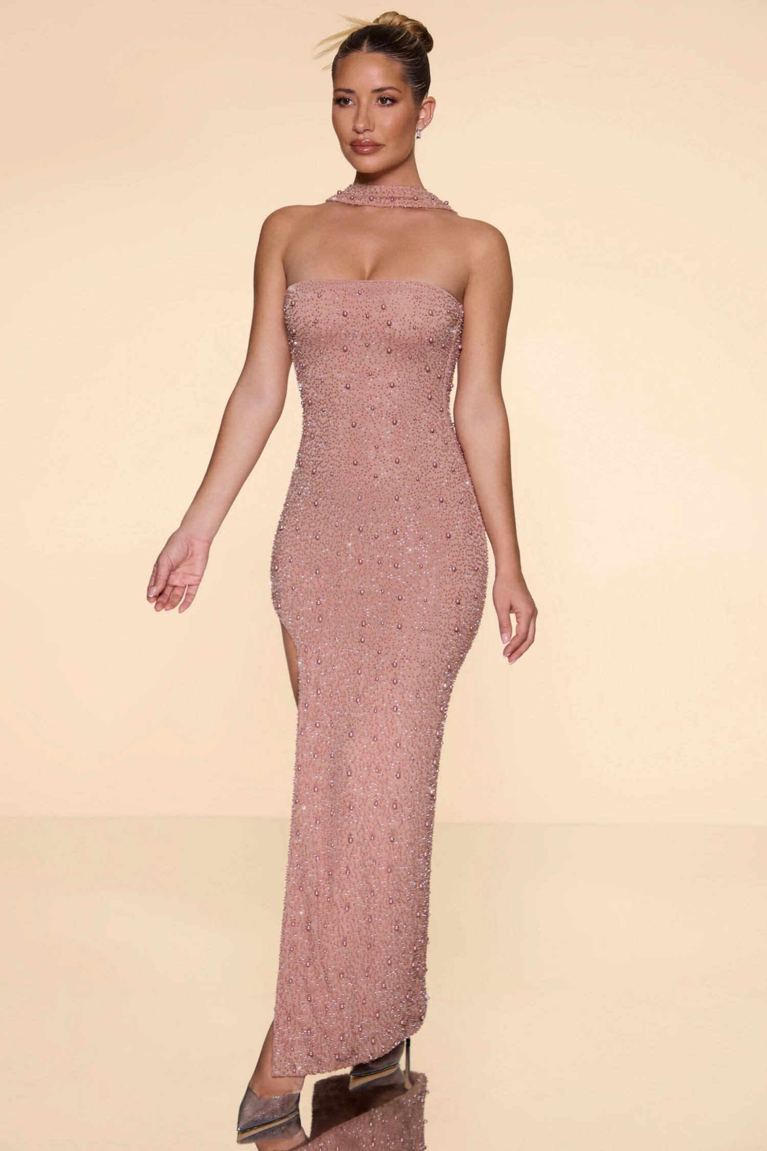 Sophisticated, elegant and fully embellished, Belgravia is perhaps our most glamorous dress yet. Designed in our curve enhancing jersey fabric, Belgravia is fully embellished with hand sewn pearl and bead adornment designed to ensure you glitter under the spotlight. With a decolletage exposing bandeau neckline, Belgravia also features a seductive low back that creates a shoulder skimming neck panel. Complete with a thigh skimming split on the left hand side, Belgravia has everything you need for a seductive evening look.