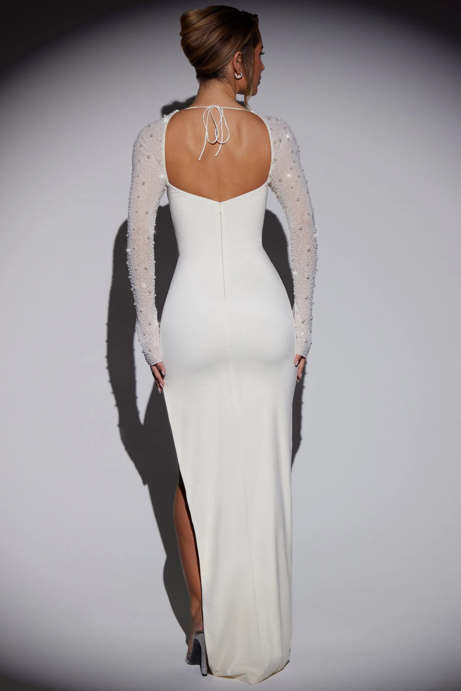Loved everything about our St Germain mini dress? Meet San Marino, our latest silhouette inspired by our TikTok sensation mini dress but cut to a glamorous maxi length. Perfect for elevating your evening wear wardrobe, the San Marino maxi dress is a bodycon design cut from our lustrous stretch satin fabric that effortlessly hugs your curves. The underwired cups and built in corsetry create a cinched in silhouette whilst the dramatic maxi skirt features a daring thigh high split that exposes the left leg. Complete with our signature semi sheer, embellished sleeves with split flare detailing, San Marino is a must have party style.