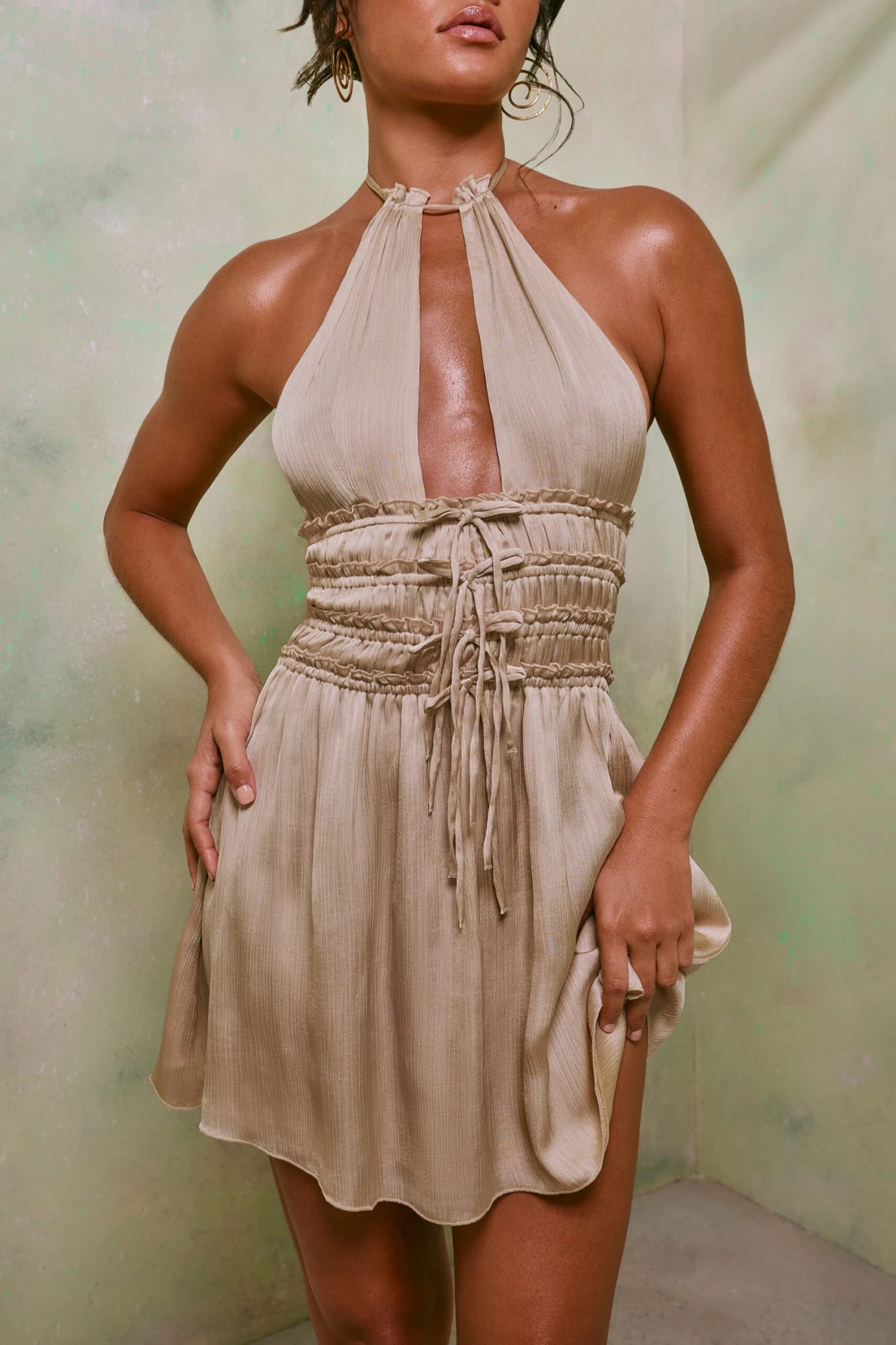The Tulia mini dress was designed to be your new season obsession. Created from our all new crinkle textured woven fabric that’s perfect for the summer months, the Tulia mini dress is a sleeveless design with an open back and adjustable halter neck fastenings, perfectly balancing flattering and functional styling. The elastic ruching within the wide waistband works to cinch your silhouette whilst also allowing the fabric to move with your body for an endlessly comfortable fit. Complete with a light and airy a-line mini skirt that skims your curves, the Tulia mini dress is a sexy and playful new season essential.Â
